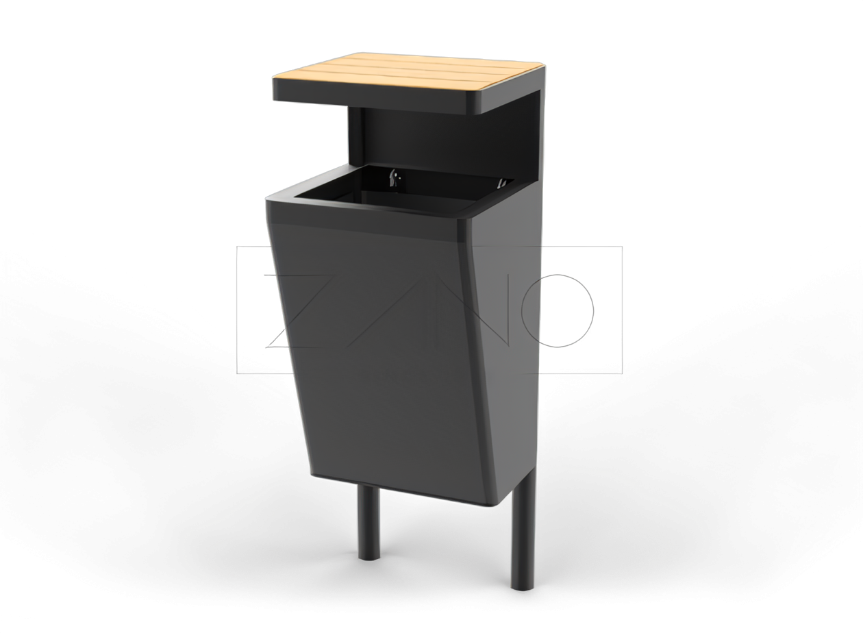 Scandik søppelbøtte er et must i et moderne byrom. Den minimalistiske designen passer lett inn i de fleste byer, gater, parker, boulevarder, torg, kjøpesentre eller jernbanestasjoner. Det er en videreføring av Scandik-serien med urbane møbler, som inkluderer benker, urbane potter, en solstasjon og kurver. Det finnes forskjellige versjoner av kurven å velge mellom: uten kalesje, med kalesje og et askebeger plassert i den øvre delen av kurven, og forskjellige versjoner av resirkuleringskurven. Kurven er laget av stål, støttet av to ben som til slutt er ment å støpes inn. Velg mellom rustfritt stål eller karbonstål, galvanisert og pulverlakkert i ønsket RAL-farge. Kurvens tak er laget av stål og tre. Velg mellom innenlandsk eller eksotisk tre. I stedet for tre kan vi bruke HPL-laminat, eller taket kan lages helt i stål. Kurven har en galvanisert, galvanisert metallplate som gjør det enkelt å skifte avfallsposer.