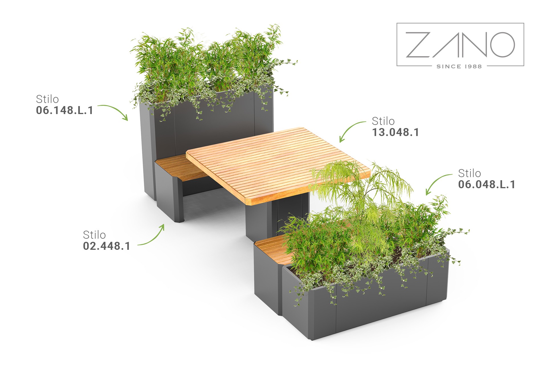 Stilo 13.048 er et stort urbant bord som er kompatibelt med benker fra Stilo-serien. Produktene kan settes ved siden av hverandre for å skape spiseplasser.