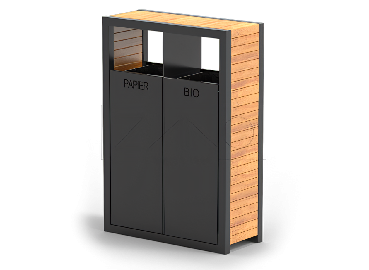 Pavo 15.263to-kammer resirkuleringsbeholder er en robust urban beholder med et moderne, universelt design, raffinert med oppmerksomhet på de minste detaljene. Konstruksjon - er laget av stål med trefinish. Stålet er tilgjengelig i et utvalg av karbonstål, galvanisert og pulverlakkert i en farge spesifisert av kunden. RAL-farge eller rustfritt stål. Tre - tilgjengelig i ditt valg av europeisk bartre, lakkert to ganger i fargen som er angitt av kunden. fargen angitt av kunden eller eksotisk tre (beskyttet ved oljing). Alternativt til tre kan vi bruke HPL eller kurven kan være helt laget av stål. Innvendige inn satser - Kurven har to innvendige innsatser laget av galvanisert metallplate. Tilgang til dem er praktisk ved å vippe den fremre delen av kurven. Festemetode - Den grunnleggende måten å feste kurven på er ved å skru kurven til fundamentet. Bestillpersonalisering - Inskripsjoner kan kuttes i kurven i henhold til den tiltenkte bruken (f.eks. Papir, metall, blandet), i rustfritt stål kan vi etse informasjon eller en logo. Et klistremerke kan påføres kurven.