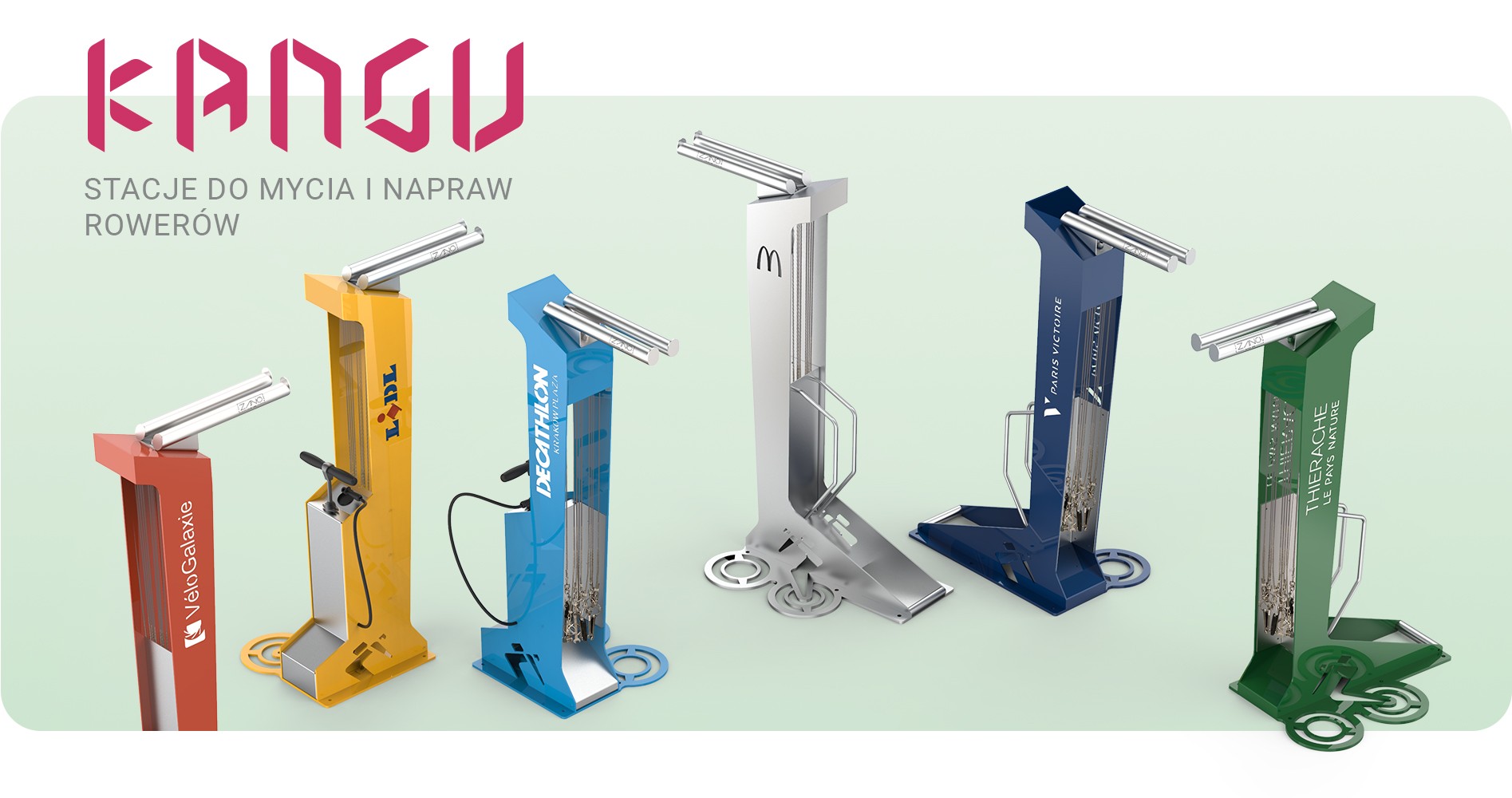 "KANGU" selvbetjent sykkelvaskestasjon er designet for selvrensing av sykler ved at brukeren bruker stasjonens struktur som base og børstene og verktøyene som følger med utstyret.